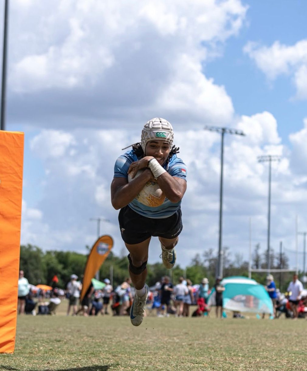 Nehemiah Gill Jr. flies into the try zone at Tropical Sevens 2026
